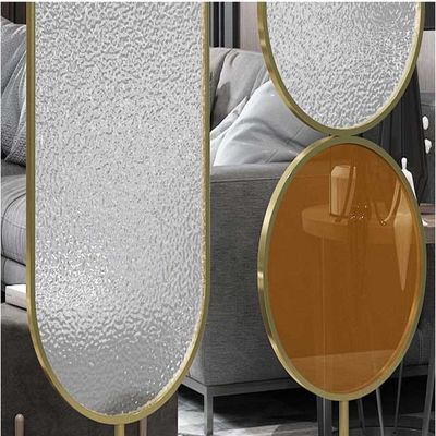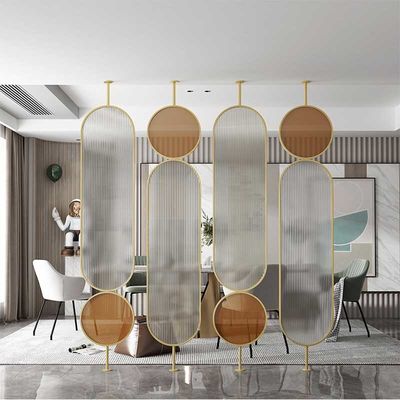 স্বর্ণ রঙের স্টেইনলেস স্টীল স্ক্রিন পার্টিশন গোলাকার আকৃতির চুলের লাইন আর্ট গ্লাস লিভিং রুমের সজ্জা সহ
